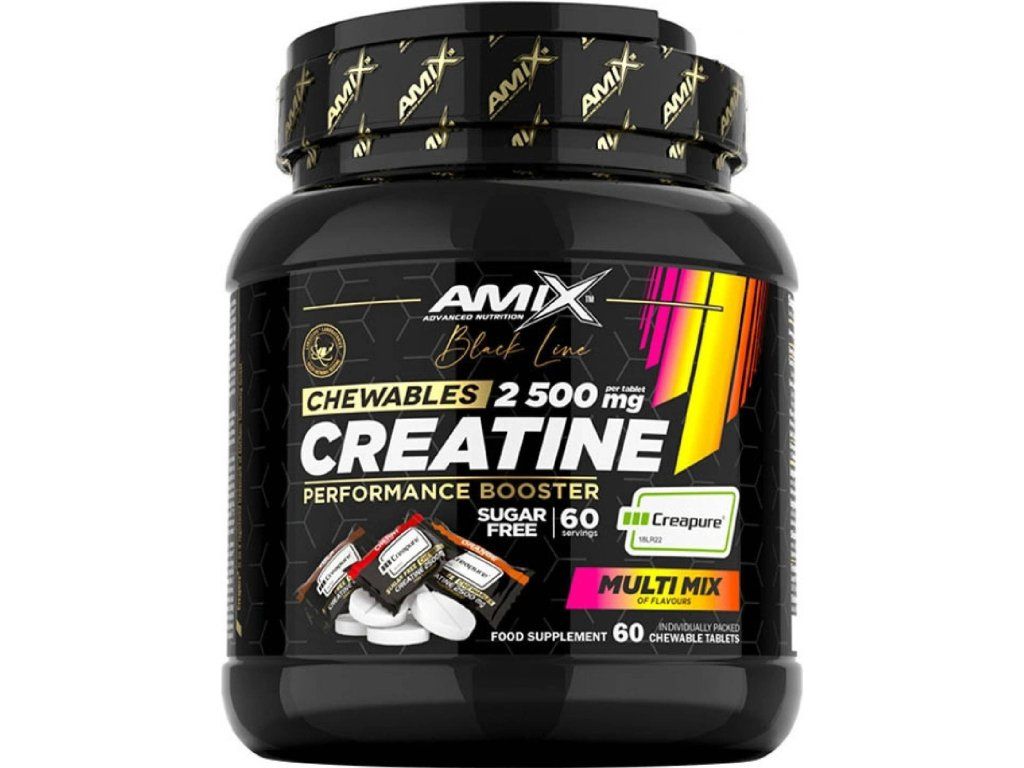 Amix Black line Creatine creapure obsahuje kvalitný kreatín monohydrát na efektívne doplnenie kreatínu pre športovcov a aktívnych ľudí. Praktická žuvacia forma umožňuje ľahké užívanie kedykoľvek počas dňa. Kreatín zvyšuje fyzickú výkonnosť pri krátkodobých intervaloch vysokej intenzity. Účinok sa dosiahne pri dennom príjme 3 g.