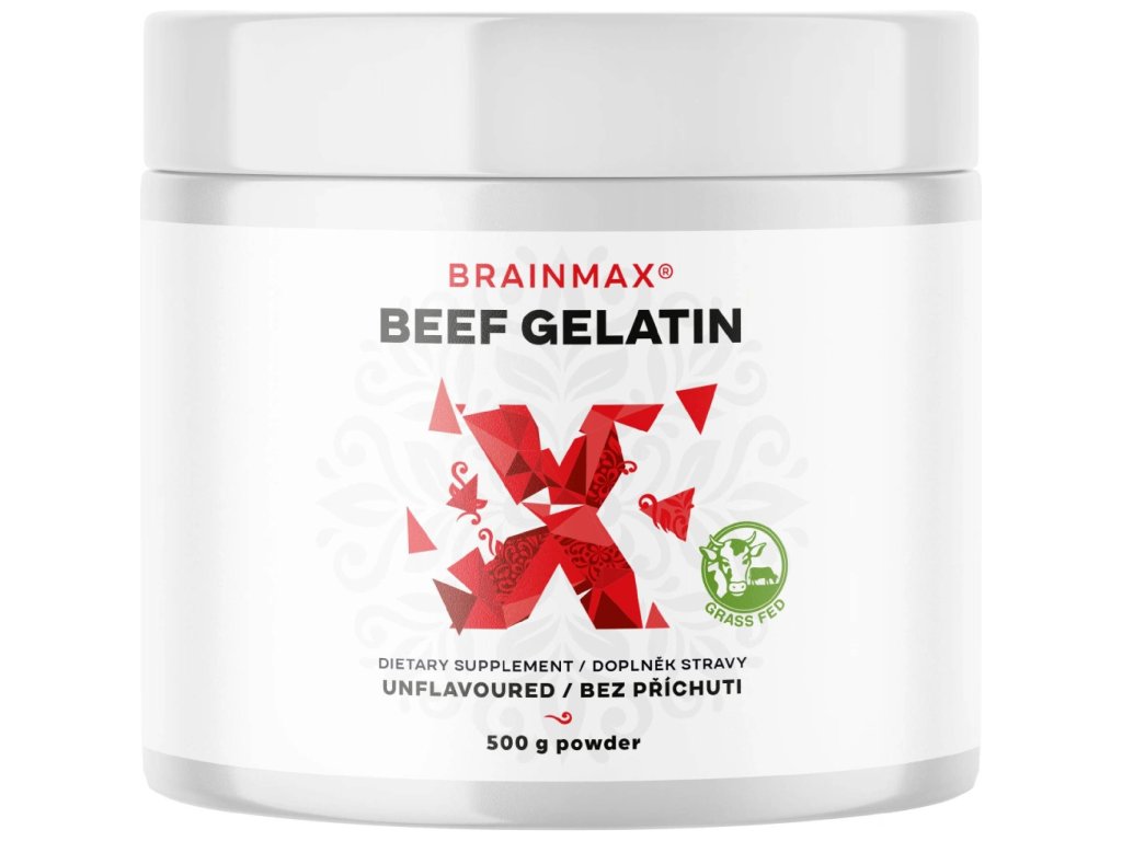 Grass-fed hovädzia želatína bez farby, chuti a zápachu. Je bohatá na tri aminokyseliny: glycín, prolín a hydroxyprolín, ktoré sú nevyhnutné pre zdravie kostí, kĺbov, pokožky a čriev. BrainMax hovädzia želatína si vyslúžila certifikáciu Grass-fed, ktorá zaručuje, že dobytok bol voľne pasený zakaždým, keď to bolo možné, zvieratá majú priestor na pohyb a nie sú prikrmované kŕmnymi zmesami. To všetko sa následne odráža na kvalite samotnej želatíny. Neobsahuje žiadne spojivá, plnivá a prísady, lepok a stopy mlieka ani iných alergénov. Môžete ju použiť na prípravu dezertov, marmelád, cukríkov, zahustenie omáčky či polievky, alebo si ju len tak pridať do čaju alebo kávy.